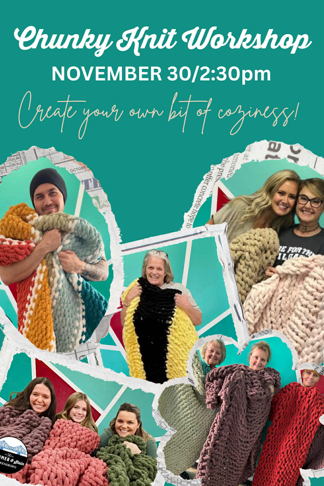 Join us at HAMMER & STAIN OWENSBORO on Sunday November 30th 2025 at 2:00pm to make one of our CHUNKY HAND CROCHET KNIT BLANKETS! You will get 140 yards of chunk chenille yarn and your throw will measure approx. 40" x 60". Chose your color choice box. Color choice is dependent on availability from supplier. This registration allows for one adult to make one project. BYOB to sip and enjoy during the workshop.